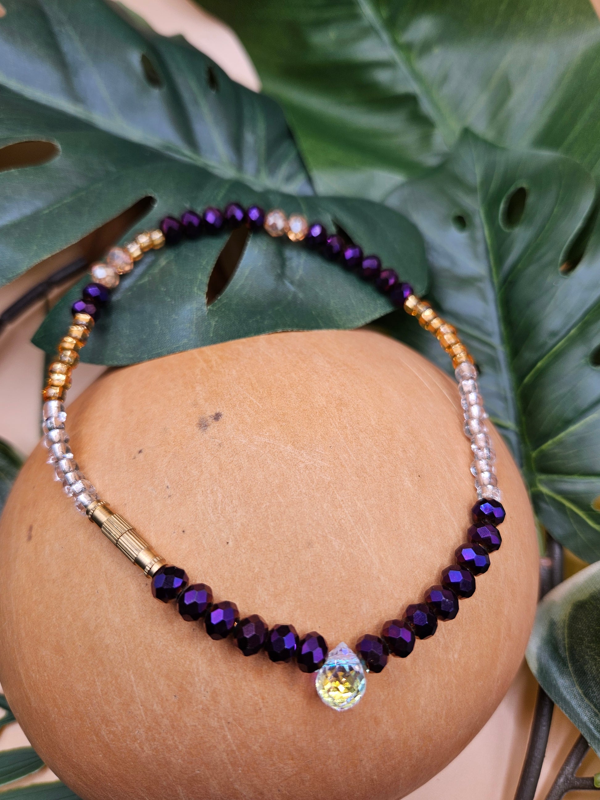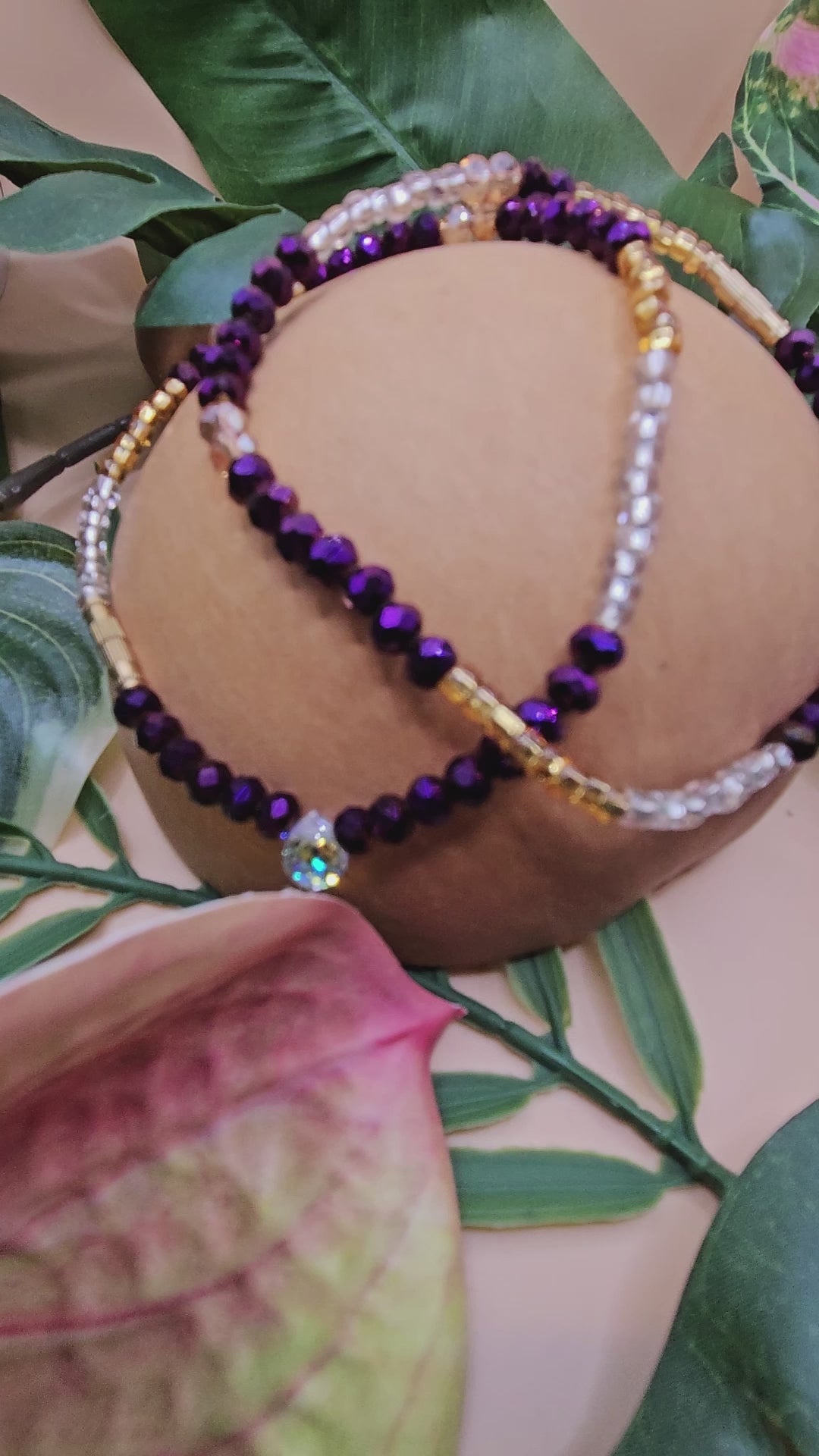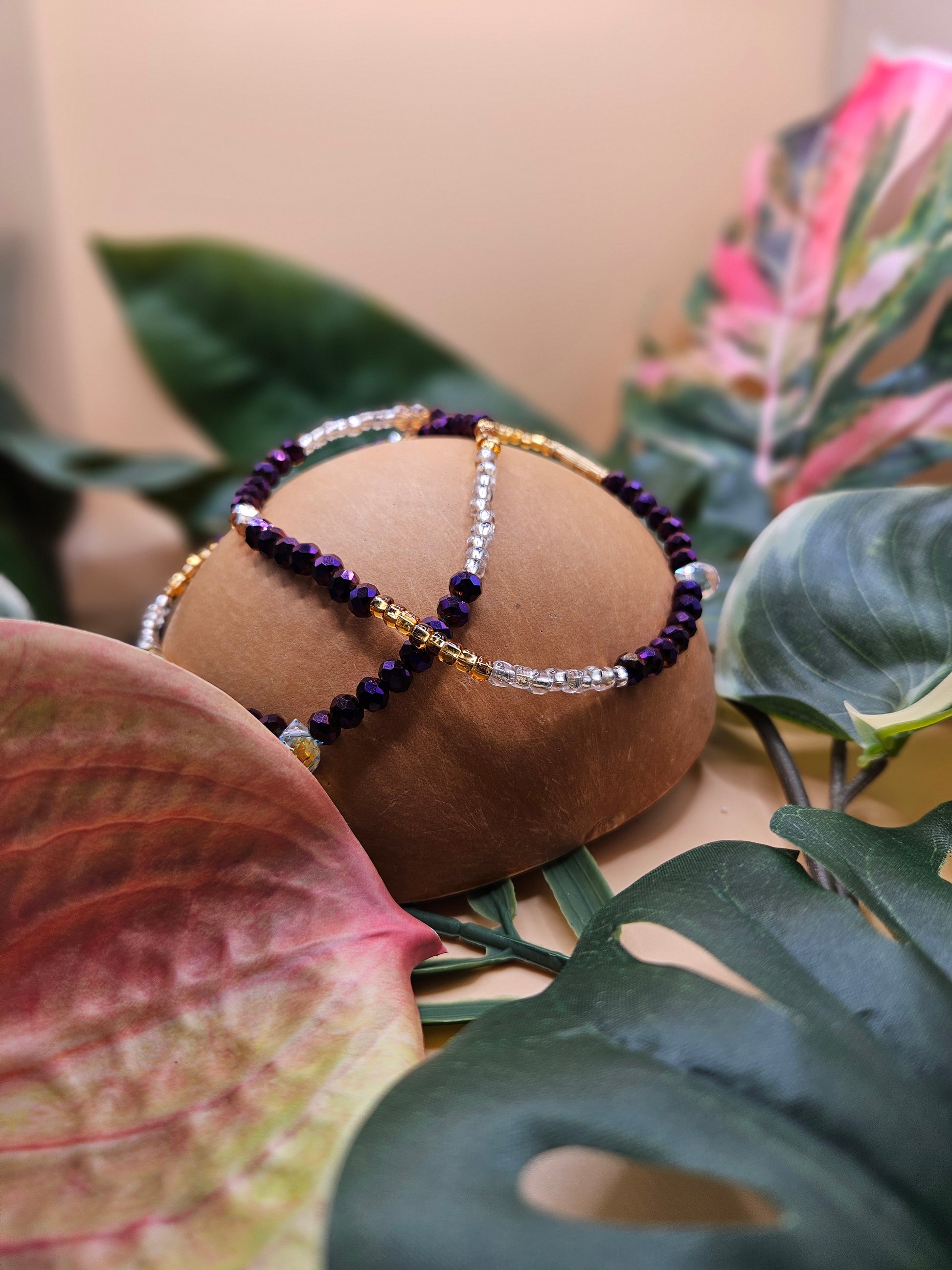 Embrace your elegance with our authentic West African anklet, handcrafted in Ghana with rich glass beads and crystal gems in dark purple, silver, and gold. Bold, graceful, and deeply rooted.